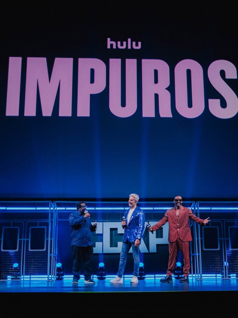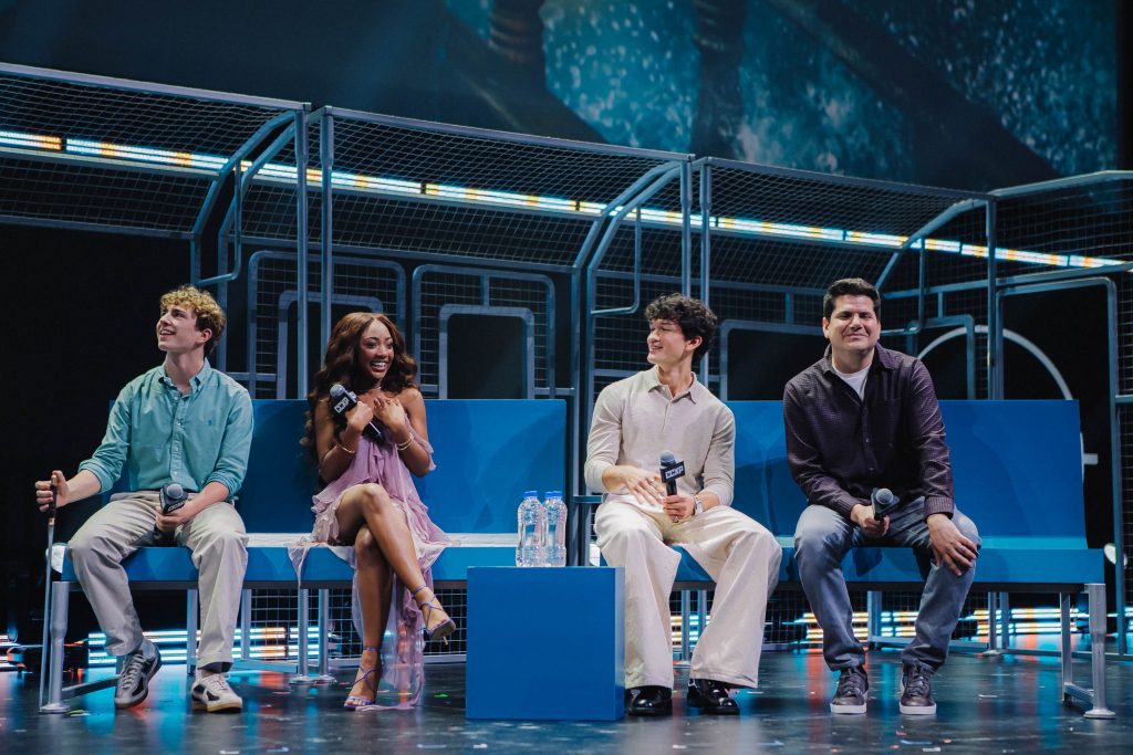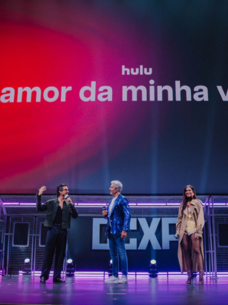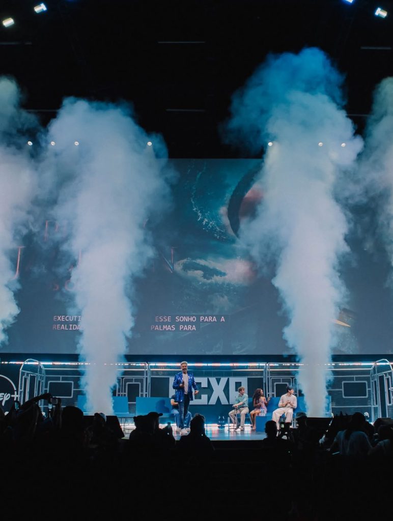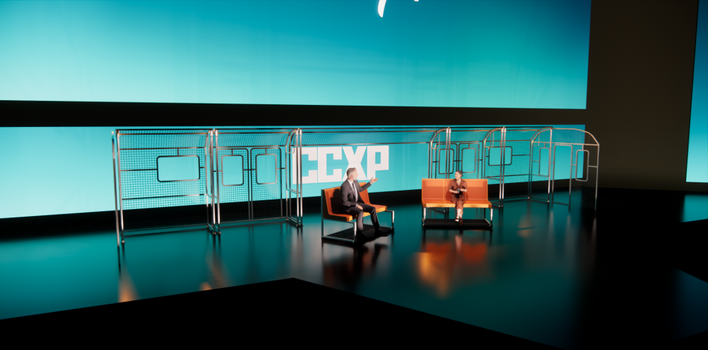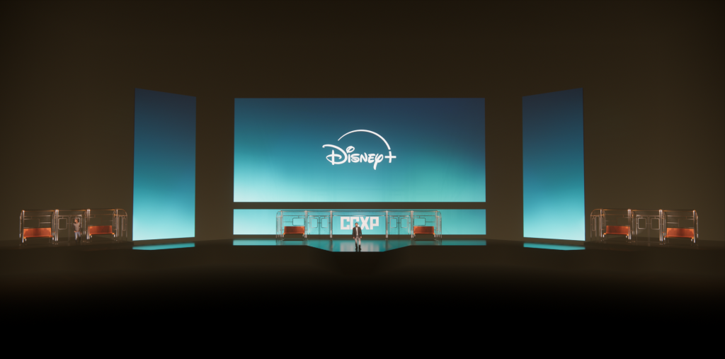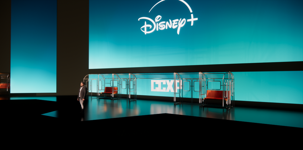 Para o painel da Disney+ na CCXP 2025, o projeto de cenografia materializou o conceito criativo da apresentação de um metrô cujas estações representariam os lançamentos do streaming para 2026. O desafio técnico de montar e desmontar a estrutura em apenas 15 minutos, somado à restrição de armazenamento das peças em áreas de pé-direito baixo, foi solucionado através da produção de módulos menores independentes que, ao serem alinhados, criavam a ilusão de um longo vagão contínuo. Adotamos uma estética wireframe em estrutura metálica para os vagões, garantindo que o design não distraísse ou obstruísse a visão da tela de fundo, enquanto o mobiliário foi concebido de forma versátil: os bancos do metrô eram móveis, permitindo o deslocamento para a frente do palco para servirem como assentos durante as entrevistas com os convidados.