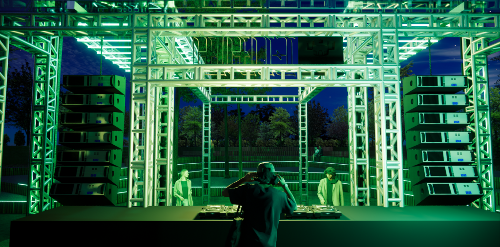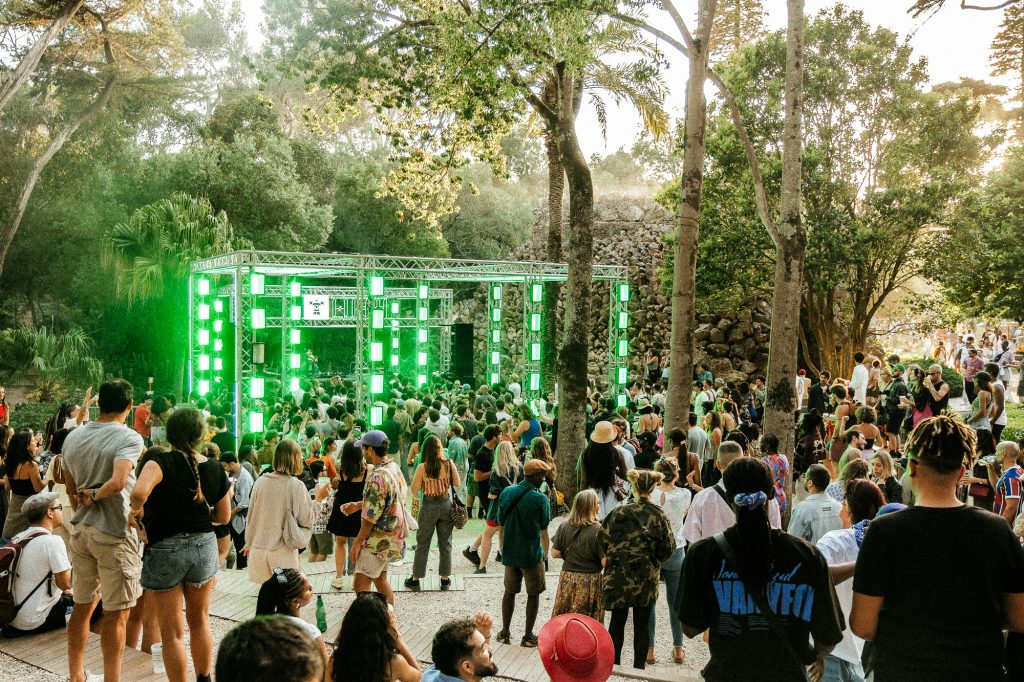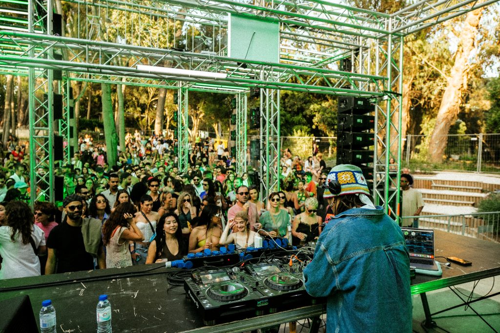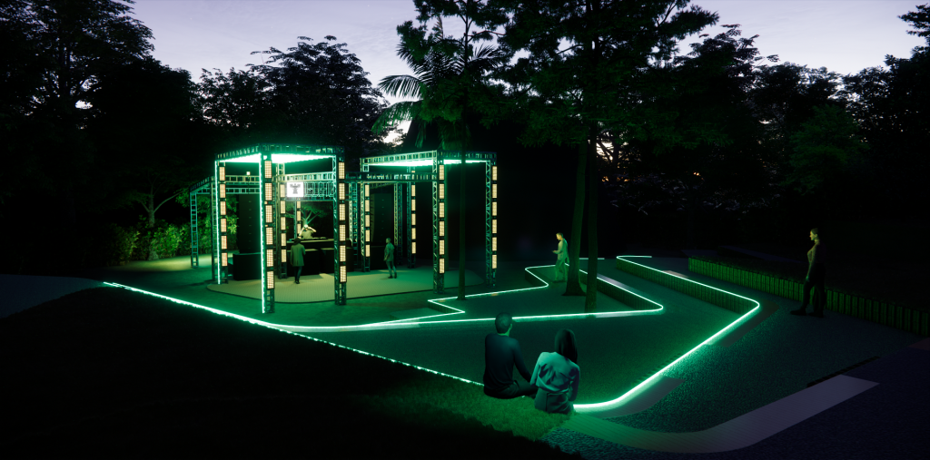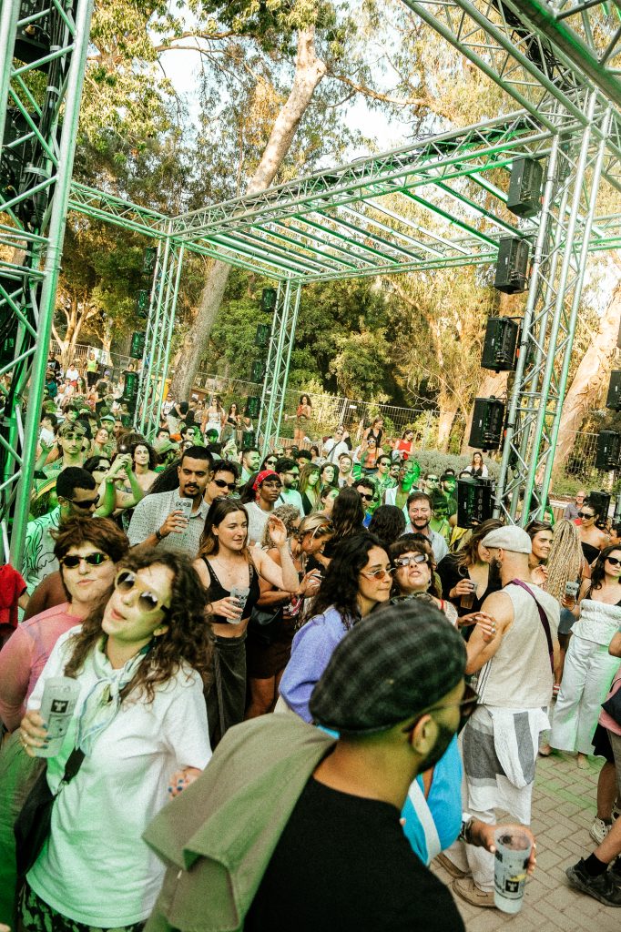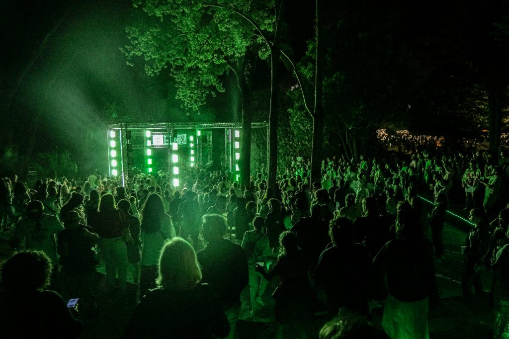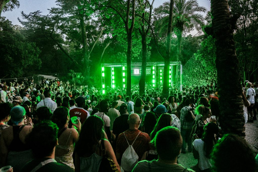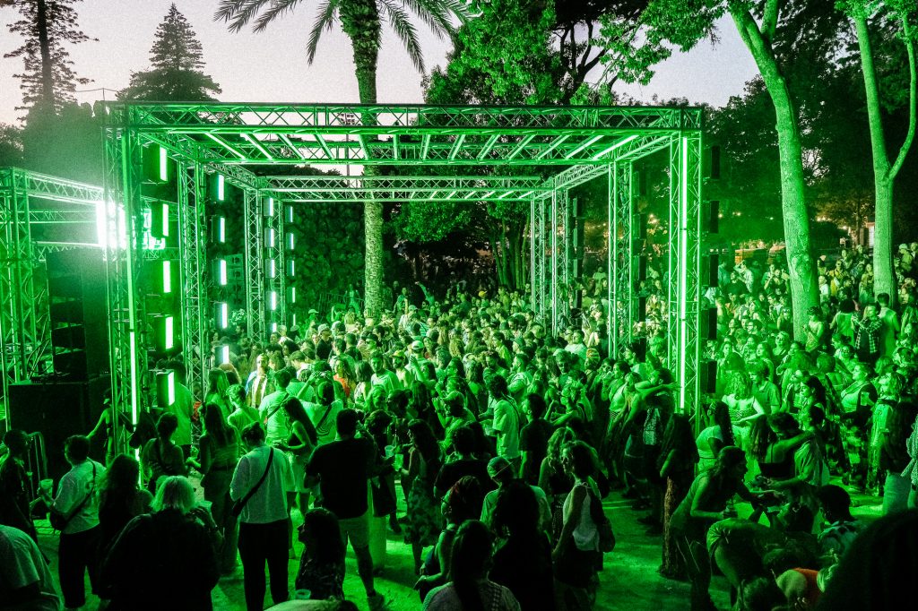 To bring the audience closer to the DJs, we installed a large exposed-iron gantry that utilizes the local greenery as a natural backdrop. The structure, which frames the landscape by day, features dynamic lighting with spotlights and LED tubes to transform the dancefloor at night. Complementing the design, green LED strips were installed along the elevated platforms, integrating the park’s original architecture with the stage. This creates contemplation areas that provide a respite from the immediate frenzy while maintaining a seamless connection to the dancefloor.