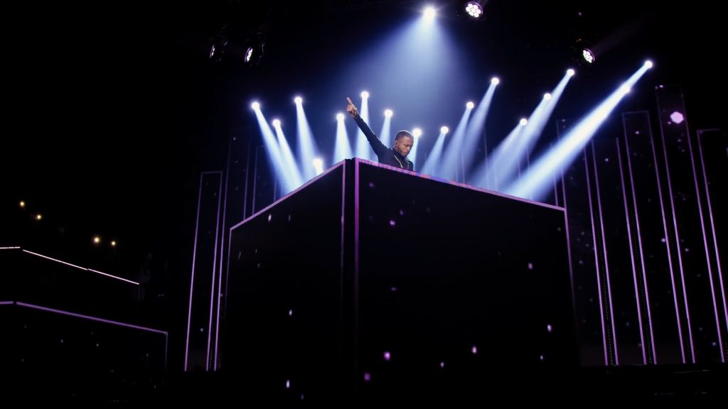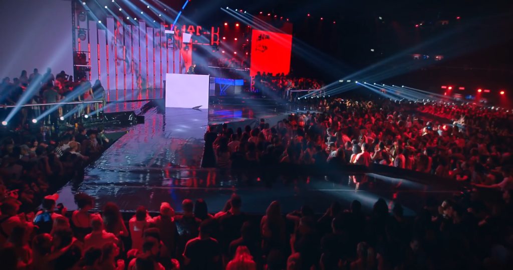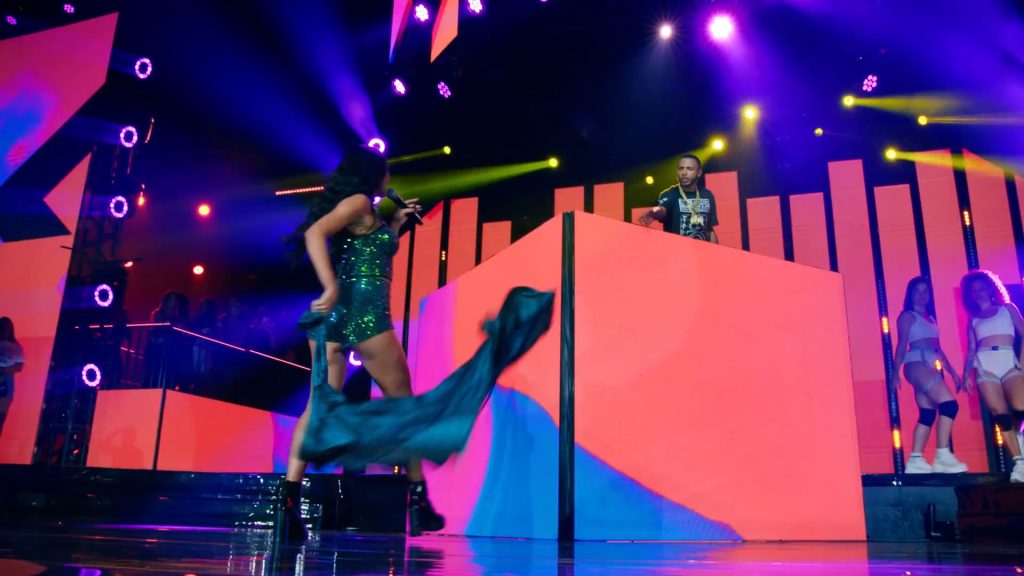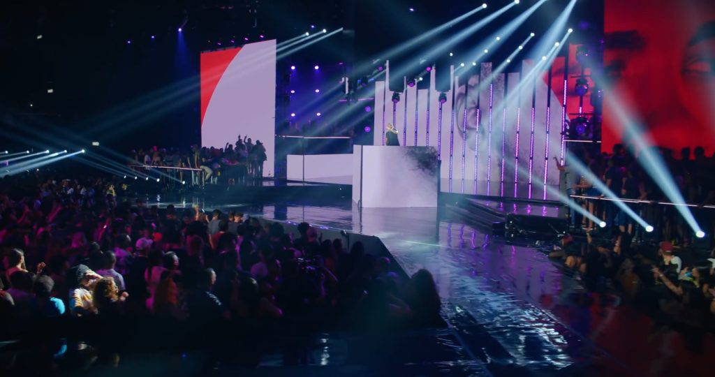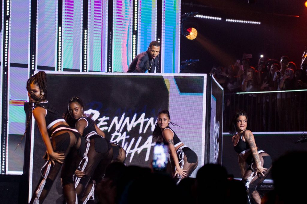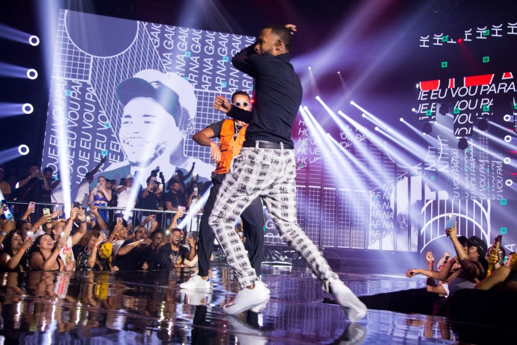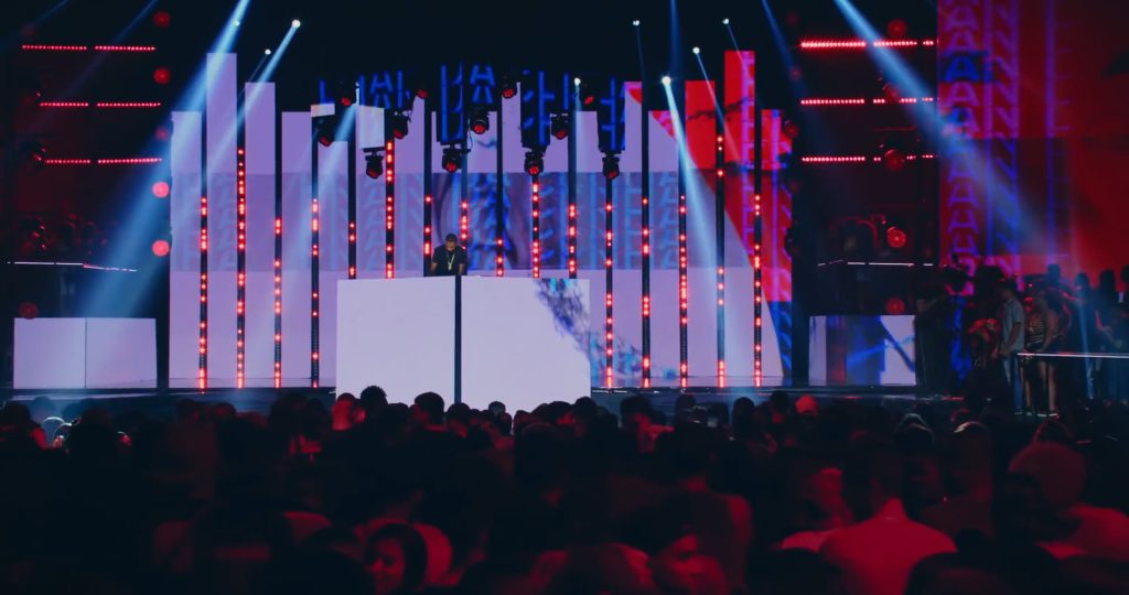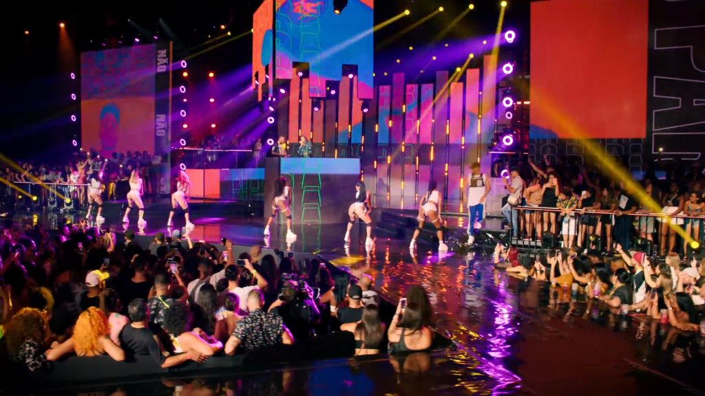 A proposta de palco e espacialização subverteu a disposição tradicional da casa de shows ao incluir áreas de público em cima do palco e passarelas que avançavam em direção à plateia, rompendo a separação entre artista e convidados e emulando a dinâmica de uma pista de dança em um baile funk. A cenografia em si concentrou-se em uma cabine central coroada por um “lustre” cênico, enquanto painéis de LED foram distribuídos de forma desconstruída por todo o espaço. Essa configuração, aliada a conteúdos visuais que funcionavam como um mosaico de cores e texturas, criou um efeito imersivo de caleidoscópio para acompanhar a performance do DJ e as participações especiais durante a gravação do DVD.